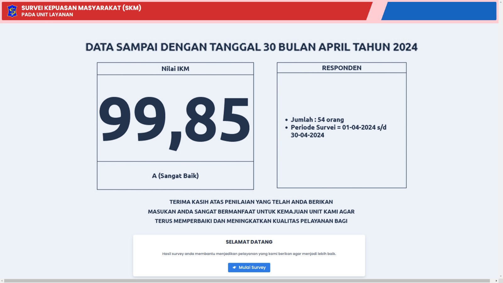 Pada Bulan MARET 2024 DPRKPP Meraih Nilai Indeks Kepuasan Masyarakat 99,63 dengan Kategori A (Sangat Baik), Terima Kasih atas Penilaian yang telah anda berikan, Masukan anda sangat bermanfaat untuk kemajuan unit kami agar terus memperbaiki dan meningkatkan kualitas pelayanan bagi masyarakat